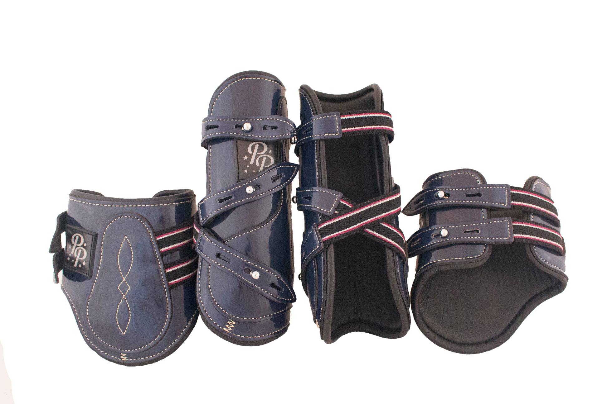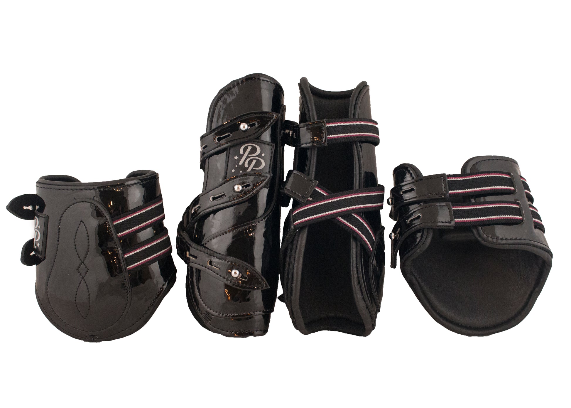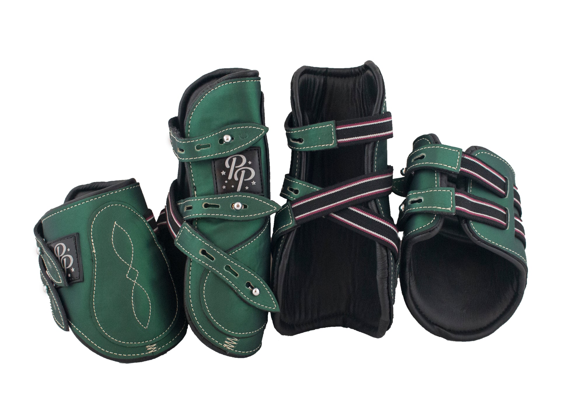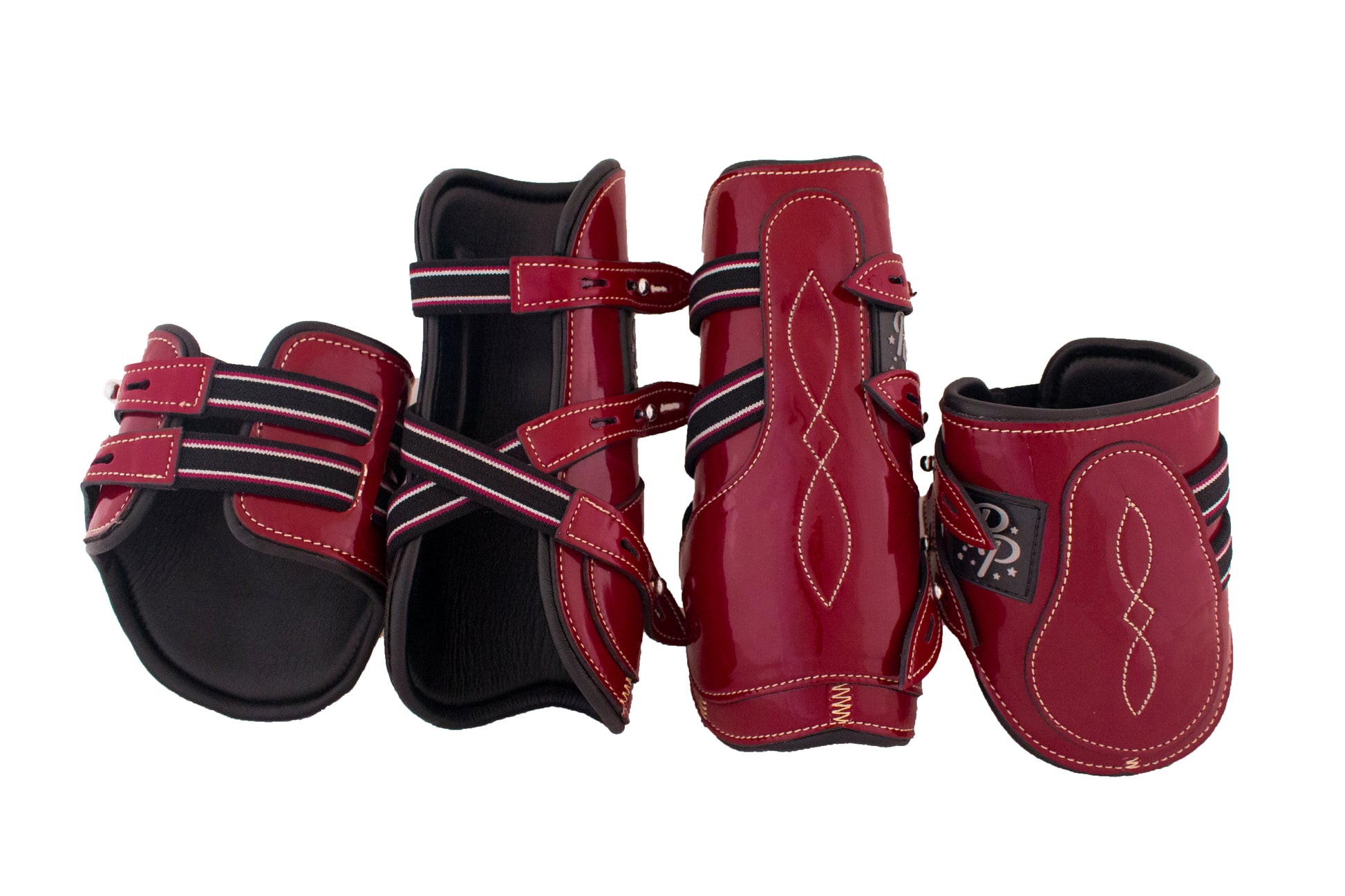 Gorgeous open front boots with a soft padded genuine leather lining for your horse's comfort and protection. Suitable for a wide range of riding disciplines in both training and competition. Set of four includes two front and two back boots.