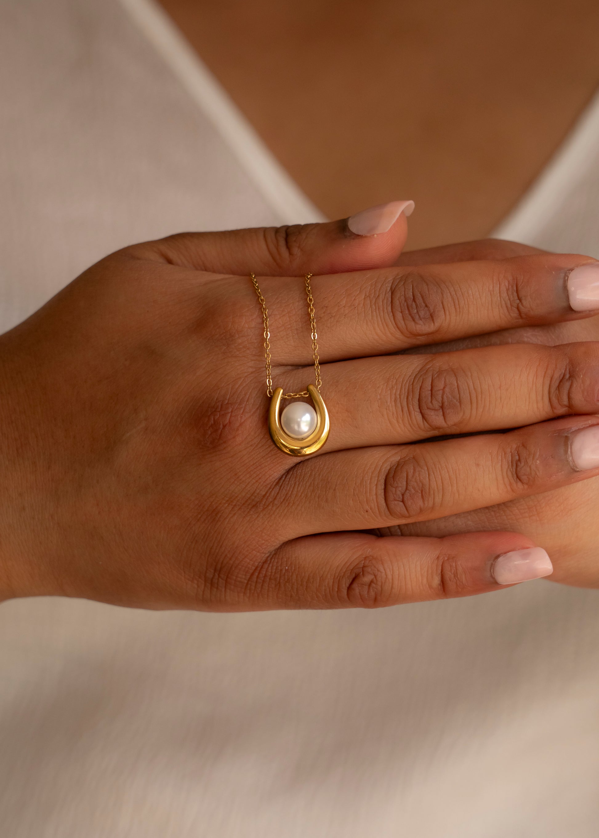 This necklace features a modern take on the classic horseshoe necklace, with a stylised horseshoe shape holding a faux pearl.