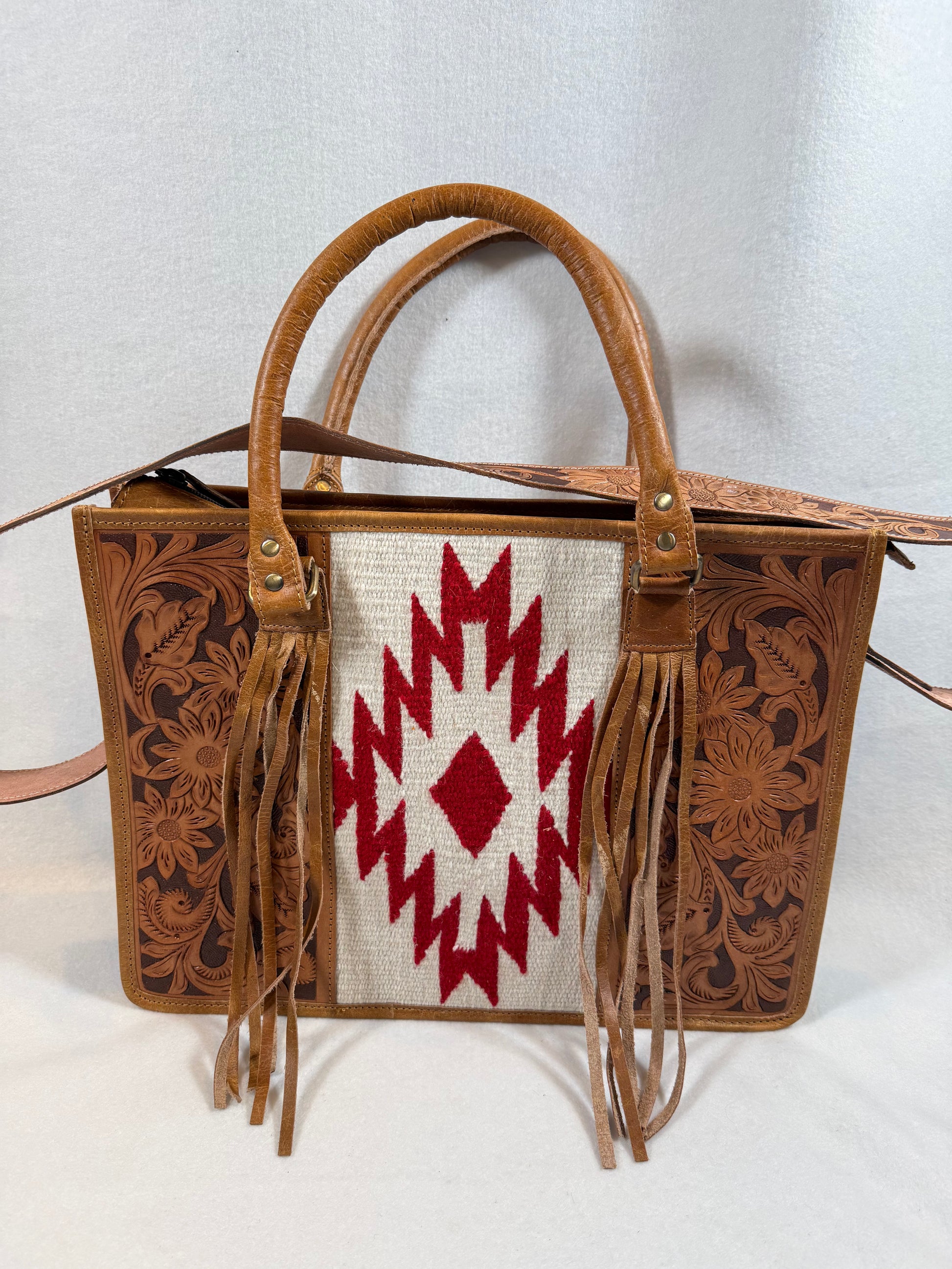 These beautiful leather handbags feature hand tooled leather panels and shoulder straps, leather tassels, and a decorative front panel in cow hide or woven fabric. These are product samples. The leather has minor imperfections as it is a natural product and leather naturally has imperfections.