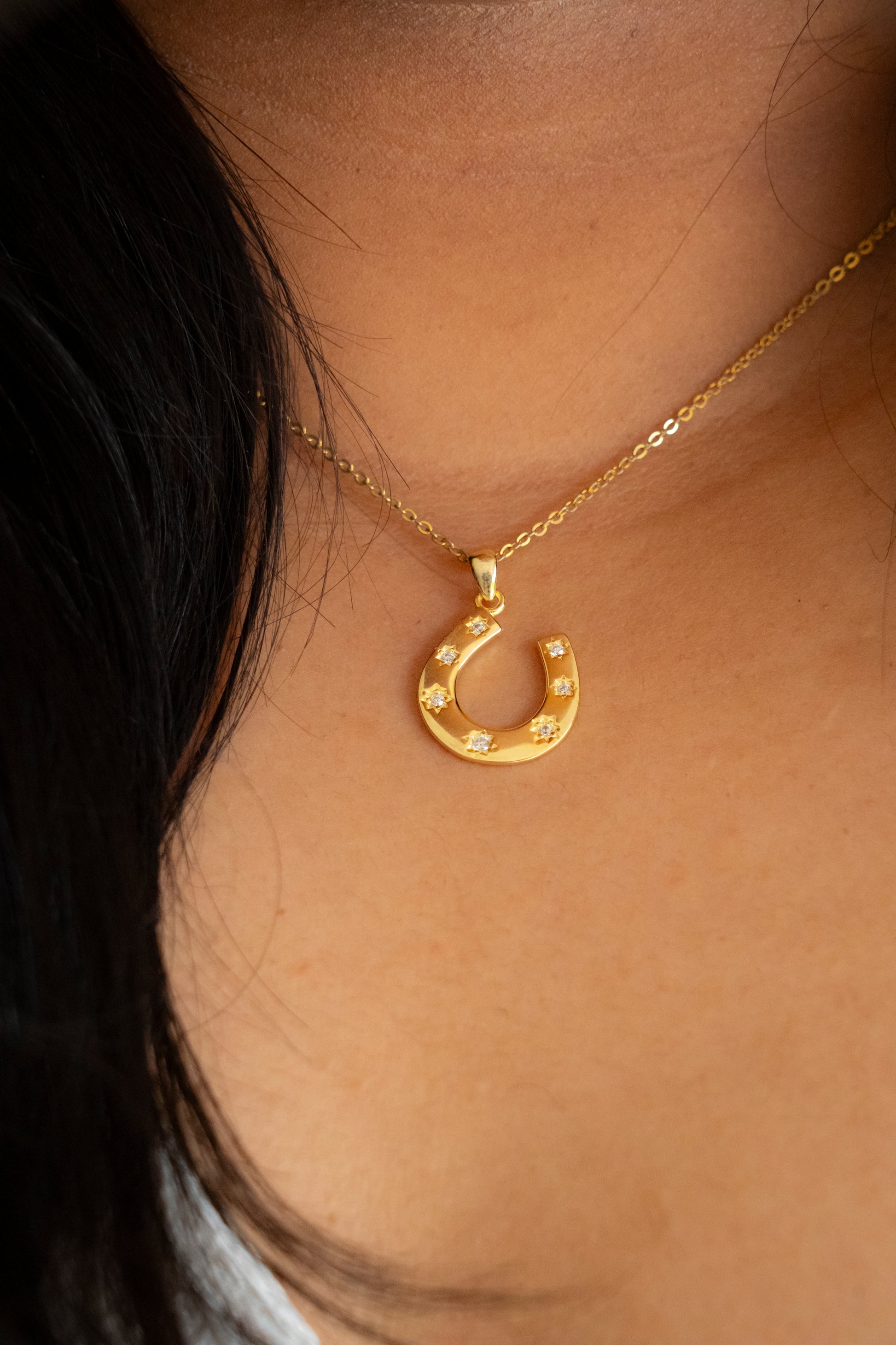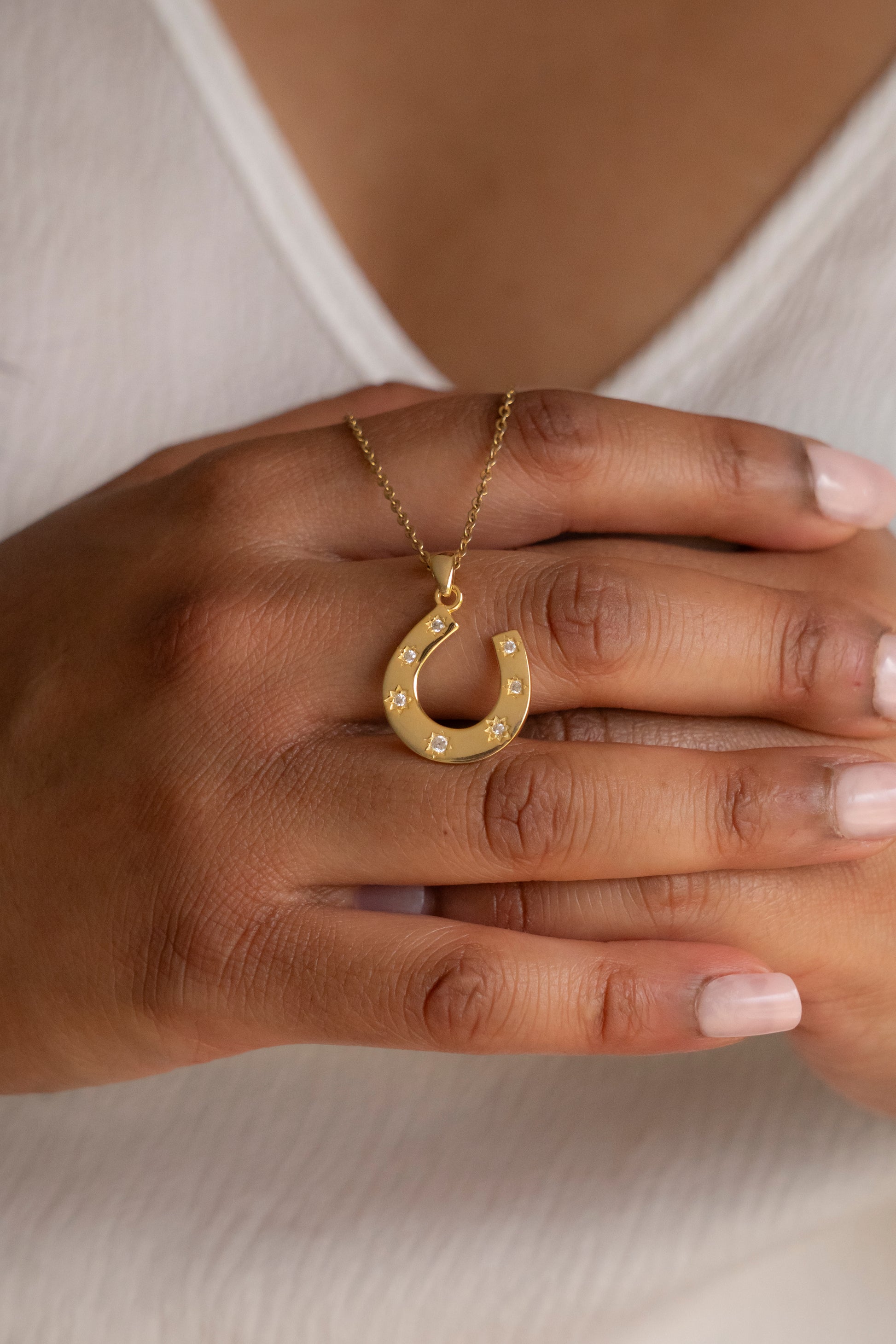 This pendant is inspired by an antique horse shoe shaped pendant. It features seven round cubic zirconias with star settings and hangs at an angle for a little twist on a classic design. Horseshoes have been a popular motif in jewellery for over two hundred years as they represent good luck. For an extra lucky boost the seven cubic zirconias represent the seven nails that were traditionally used in horseshoes, as seven was considered a very lucky number. The back of the pendant is smooth with tiny holes allowing the cubic zirconias to be cleaned.
